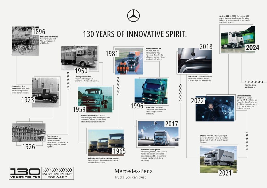 2026 is the year that sees Mercedes-Benz mark the 130th anniversary of the world’s first truck. Presented by Gottlieb Daimler in 1896, the two cylinder “Phoenix” rear mounted engine delivered four horsepower via a displacement of 1.06 litres, driving the rear axle via a belt system. Coil springs protected the sensitive engine from vibrations, and the front axle was steered via chains.