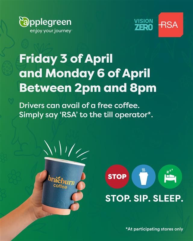 As part of the RSA’s #StopSipSleep initiative, motorists can call into Applegreen and avail of a free coffee by saying RSA at the till, from 2pm to 8pm on Friday and Monday.