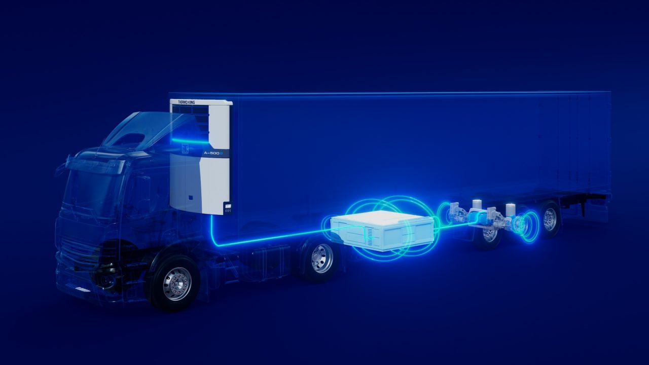 The trailer features a BPW ePower Axle, which harvests kinetic energy from braking and downhill running, stores it, and uses it to power the refrigeration unit in real time.