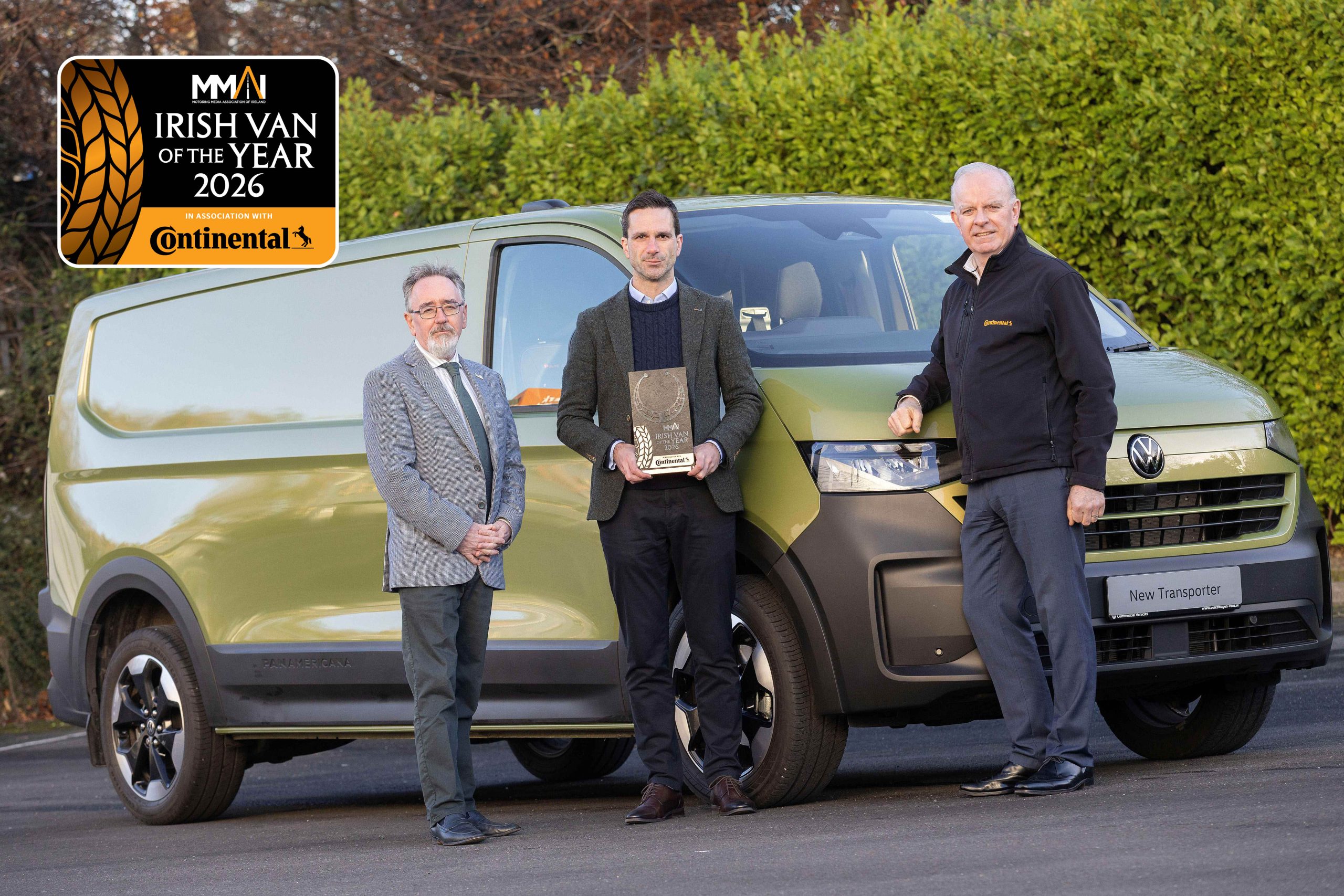 Paul White of the Motoring Media Association of Ireland (MMAI) Irish Van of the Year jury, with Paul Hunt of the Volkswagen Commercial Vehicles team and Tom Dennigan, Continental Tyres Ireland; with the Volkswagen Transporter which took the Irish Van of the Year title for 2026.